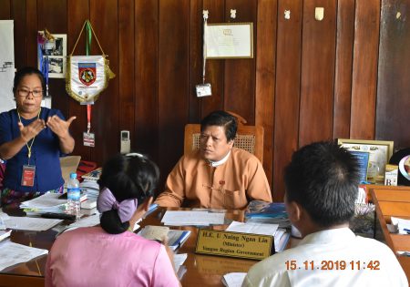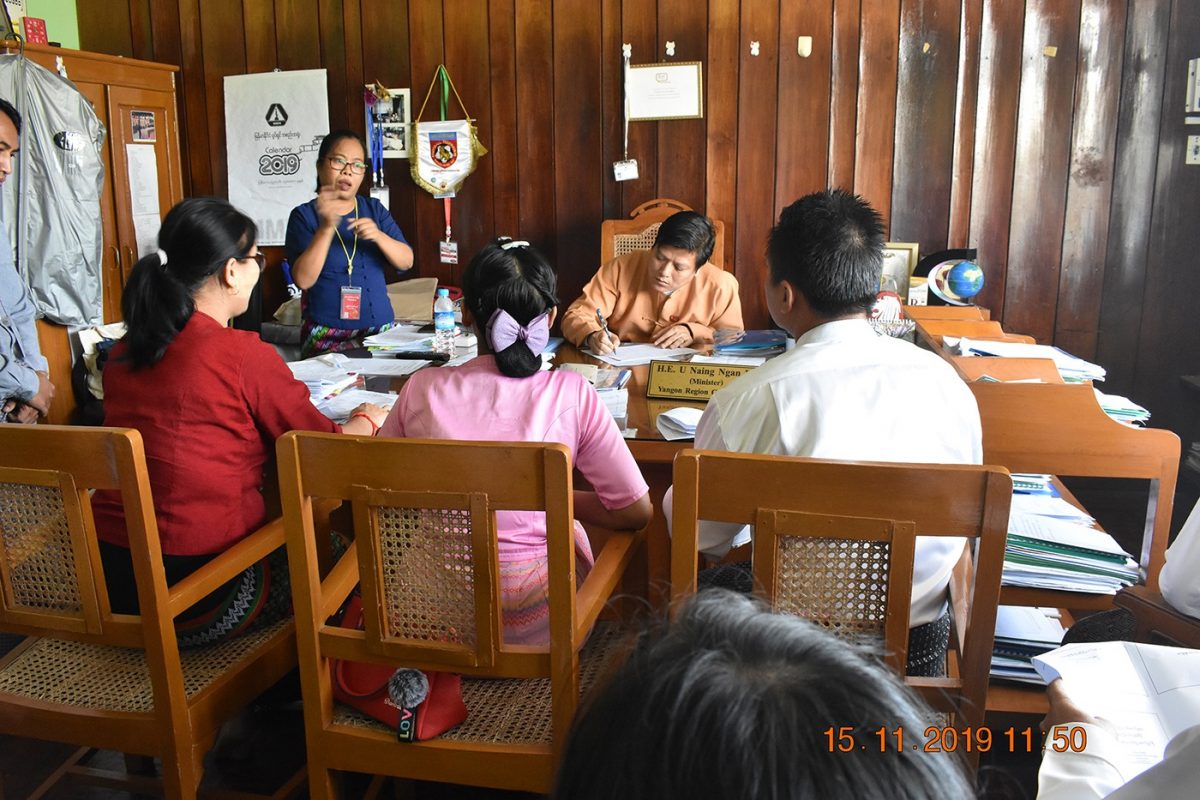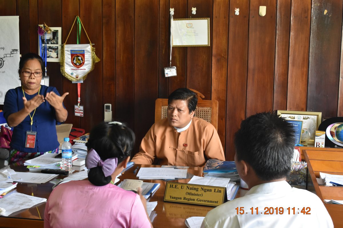 ရန်ကုန်တိုင်း ဒေသကြီး အစိုးရအဖွဲ့၊ လူမှုရေးဝန်ကြီး ဦးနိုင်ငံလင်း ကို နားမကြားအဖွဲ့အစည်းများ ကျောင်းများမှ ကိုယ်စားလှယ်များ ပါဝင်သည့် Advocacy team က လာရောက်တွေ့ဆုံပြီး ရန်ကုန်တိုင်းအတွင်းရှိ နားမကြား လူမှုအဖွဲ့အစည်းဝင်များ ကြုံတွေ့နေရသည့် အခက်အခဲများနှင့် စိန်ခေါ်မှုများ၊ မူဝါဒ ဆိုင်ရာ အကြံပြုချက်များကို တင်ပြခဲ့ပြီး လမ်းညွှန်မှုများ ခံယူခဲ့ပါသည်။