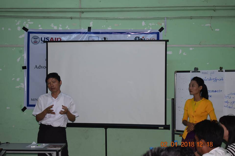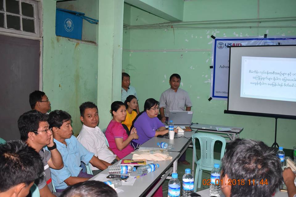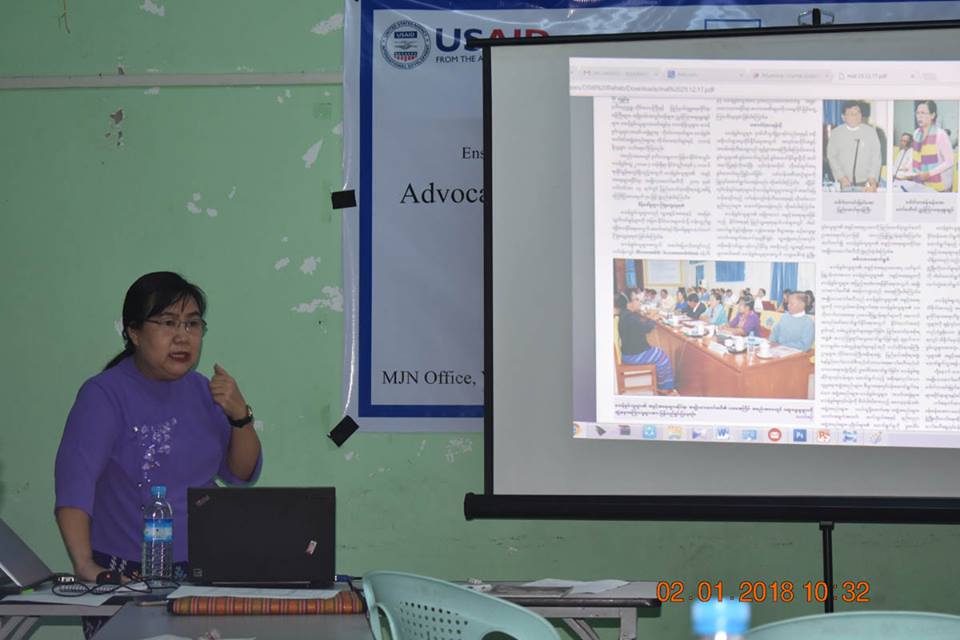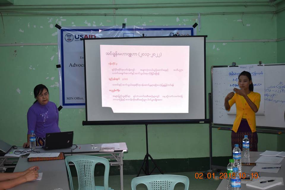 FHI 360 CSM Project ၏ ပံ့ပိုးမှုဖြင့် ဆောင်ရွက်နေသော အကြားအာရုံမသန်စွမ်းသူများအတွက် သတင်းအချက်အလက် ရရှိမှုသေချာစေရေးစီမံကိန်း၏ တစ်စိတ်တစ်ဒေသအဖြစ် မြန်မာဂျာနယ်လစ် ကွန်ရက်နှင့် အသိပေး ဆွေးနွေးပွဲတစ်ရပ်ကို ၂၀၁၈ ခုနှစ်၊ ဇန်နဝါရီလ ၂ ရက်နေ့တွင် ရန်ကုန်တိုင်း၊ ကျောက်တံတားမြို့နယ်၊ ၃၄ လမ်းရှိ MJN ရုံး၌ အောင်မြင်စွာ ပြုလုပ်နိုင်ခဲ့ပါသည်။ အဆိုပါ ဆွေးနွေးပွဲ၌ အကြားအာရုံမသန်စွမ်းသူများကို ဆွံအနားမကြားဟု သုံးနှုန်းခဲ့သည့် ၂၀၁၇ ခုနှစ်၊ ဒီဇင်ဘာလ ၂၉ ရက်နေ့ထုတ် သတင်းစာများတွင် ဖော်ပြပါရှိသော သတင်းဖော်ပြချက်အပါအဝင် မသန်စွမ်းသူများကို လေးစားသမှုဖြင့် သတင်းရေးသားဖော်ပြနိုင်ရေး၊ အင်ချွန်းမဟာဗျူဟာ (၂၀၁၃-၂၀၂၂) ပါ ရည်မှန်းချက်များနှင့် သတ်မှတ်ချက်များ၊ မသန်စွမ်းသူများ၏ အခွင့်အရေးဥပဒေပါ သတင်းအချက်အလက် ရပိုင်ခွင့် စသည်တို့ကို အသိပေး ဆွေးနွေးနွေးခဲ့ပြီး MJN ဖက်မှလည်း အပြုသဘောဆောင်သော ဆွေးနွေးမှုများဖြင့် အောင်မြင်စွာ ဆွေးနွေးနိုင်ခဲ့ပါသည်။