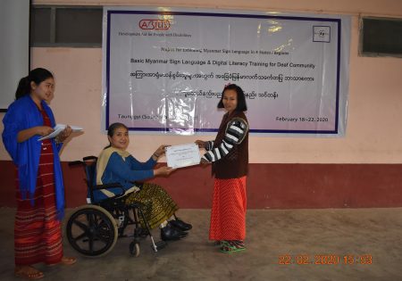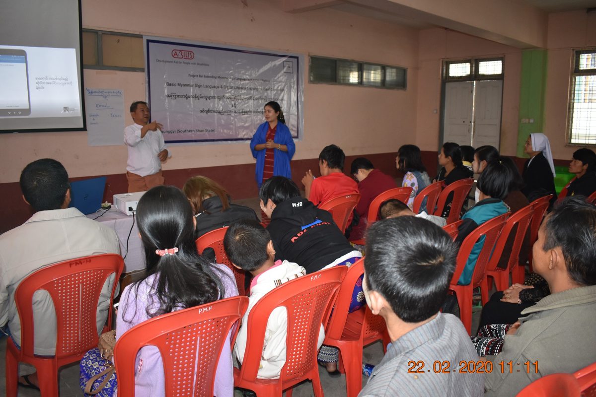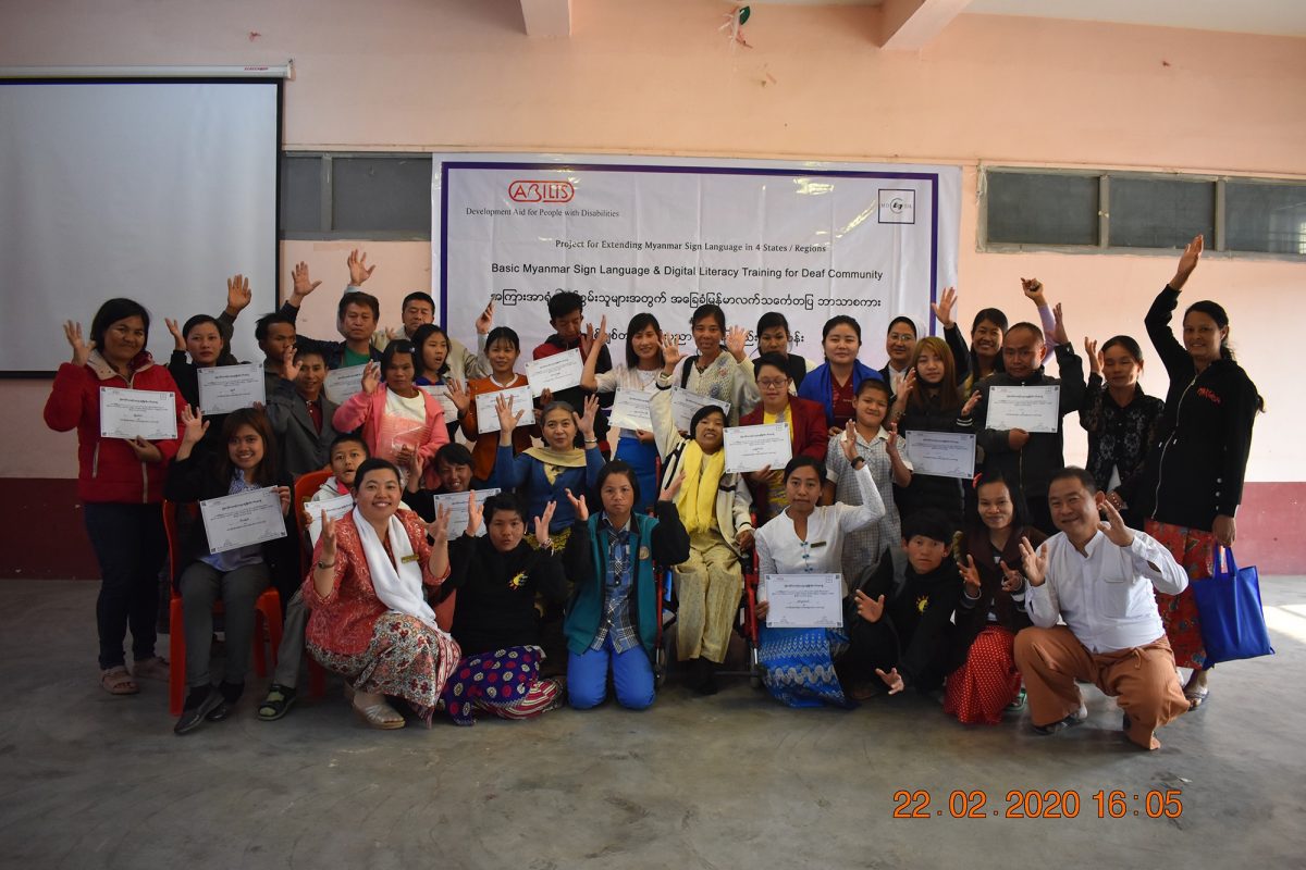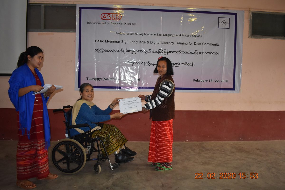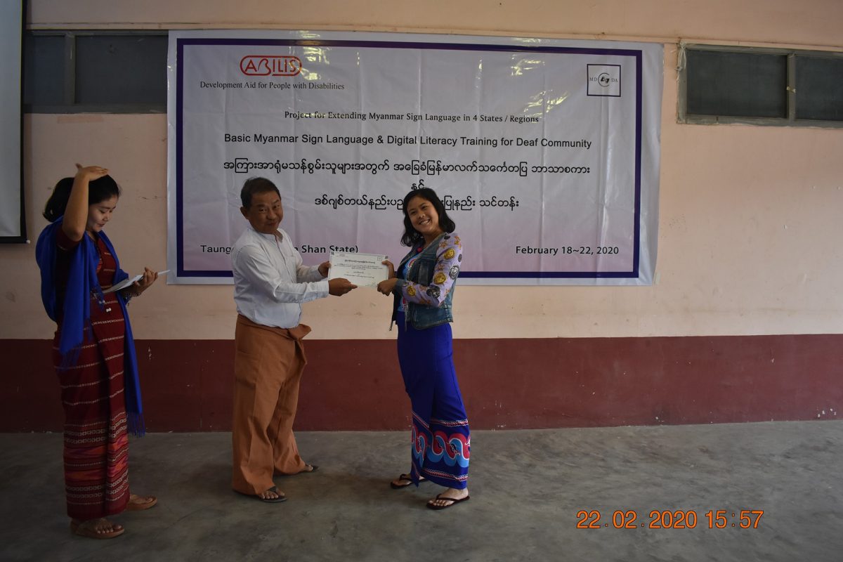 မြန်မာနိုင်ငံ နားမကြားသူများ ဖွံ့ဖြိုးတိုးတက်ရေးအဖွဲ့သည် Abilis Foundation ၏ ပံ့ပိုးမှု၊ မီလီ တောင်ကြီးရုံးခွဲ ၏ ပူးပေါင်း ပါဝင်မှု၊ Morning Star ID အဖွဲ့၏ ကူညီမှုတို့ဖြင့် မြန်မာနိုင်ငံနားမကြားသူများ ဖွံ့ဖြိုးတိုးတက်ရေးအဖွဲ့က ရှမ်းပြည်နယ်တောင်ပိုင်း၊ တောင်ကြီးမြို့တွင် အခြေခံလက်သင်္ကေတပြ အကြားအာရုံမသန်စွမ်းသူများ၊ အခြားသော မသန်စွမ်းသူများအတွက် အခြေခံ လက်သင်္ကေတပြ ဘာသာစကား သင်ခန်းစာများနှင့် ဒီဂျစ်တယ် သိမြင်နားလည်မှုဆိုင်ရာ အသိအမြင်ဖွင့် သင်တန်း တို့ကို တောင်ကြီးမြို့ရှိ စိန်ဂျိုးဇက် ခန်းမတွင် ၅ ရက်တာ အောင်မြင်စွာ ဖွင့်လှစ် သင်ကြား ပို့ချပေးနိုင်ခဲ့ပါသည်။