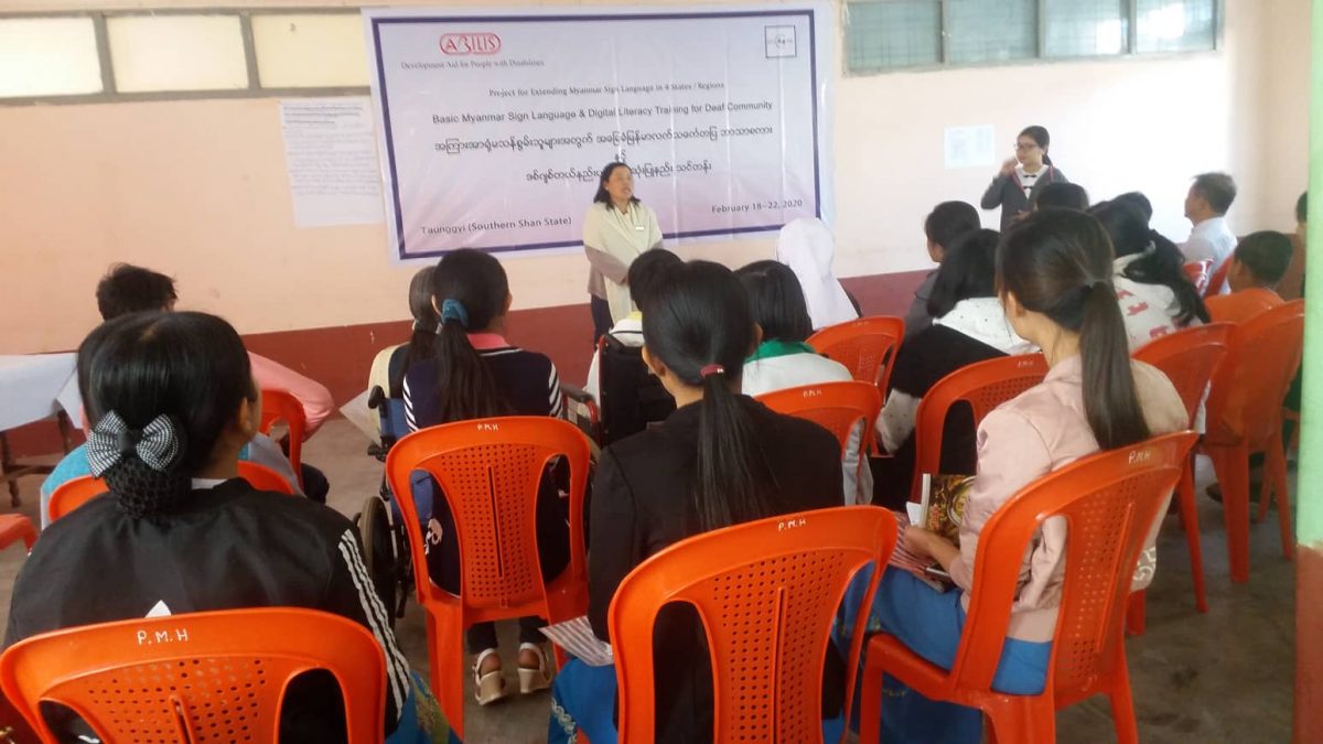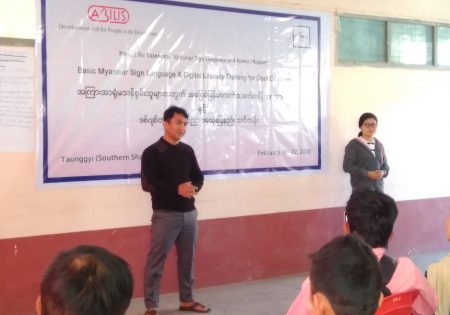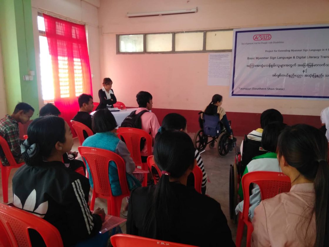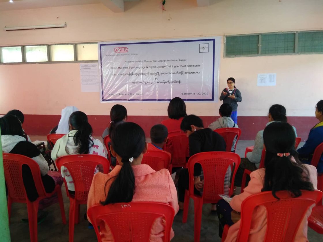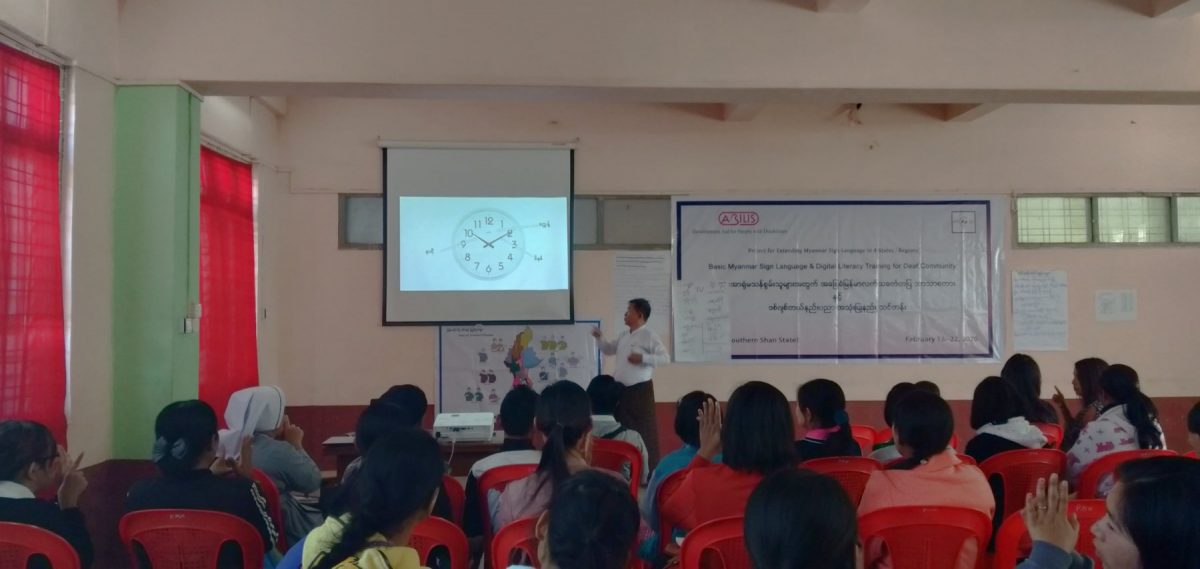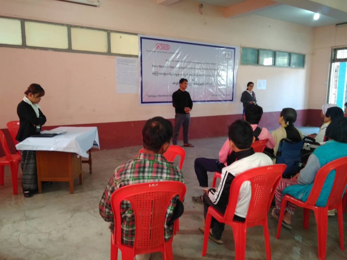 Abilis foundation ၏ ပံ့ပိုးမှု ၊ မီလီ တောင်ကြီးရုံးခွဲ ၏ ပူးပေါင်း ပါဝင်မှု၊ Morning Star ID အဖွဲ့၏ ကူညီမှုတို့ဖြင့် မြန်မာနိုင်ငံနားမကြားသူများ ဖွံ့ဖြိုးတိုးတက်ရေးအဖွဲ့က ရှမ်းပြည်နယ်တောင်ပိုင်း၊ တောင်ကြီးမြို့တွင် အခြေခံလက်သင်္ကေတပြ ဘာသာစကား သင်တန်းတစ်ရပ်ကို ဖွင့်လှစ်ပို့ချပေးလျက်ရှိသည်။ ၅ ရက်တာပြုလုပ်မည့် သင်တန်းအစီအစဉ်တွင် ပါဝင်သည့် မှတ်တမ်းများအနက် သင်တန်းပထမနေ့ပုံရိပ်များ ကို ရှေးဦးစွာ တင်ပြထားပါသည်။