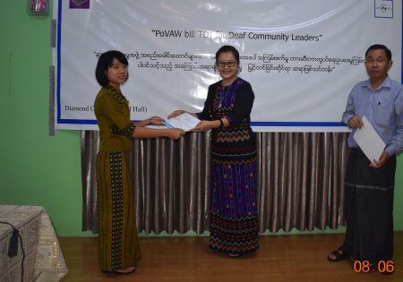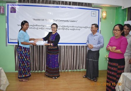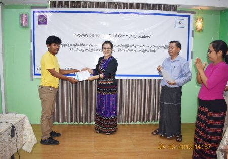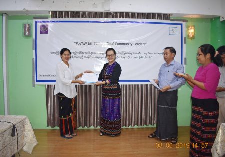 GEN ၏ ပံ့ပိုးမှုဖြင့် မြန်မာနိုင်ငံနားမကြားသူများ ဖွံ့ဖြိုး တိုးတက်ရေးအဖွဲ့သည် အမျိုးသမီးများအား အကြမ်းဖက်မှုမှ တားဆီးကာကွယ်ရေး ဥပဒေမူကြမ်း ကို နားမကြားလူမှုအသိုင်းအဝိုင်း အတွင် းသိမြင်နားလည်မှု မြှင့်တင်ရေးအတွက် ၂ ရက်တာ ဆရာဖြစ်သင်တန်းတစ်ရပ်ကို ၂၀၁၉ ခုနှစ်၊ ဇွန်လ ၇ နှင့် ၈ ရက်နေ့များတွင် ရန်ကုန်၊ လှည်းတန်းရှိ ဒိုင်းမွန်းကွန်ဒို၌ အောင်မြင်စွာ ကျင်းပပြုလုပ်နိုင်ခဲ့ပါသည်။