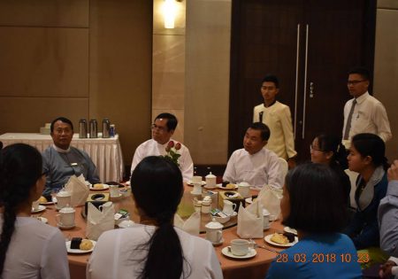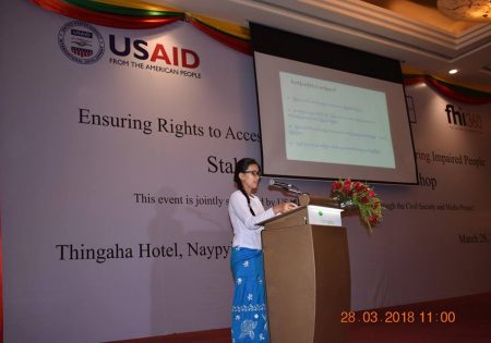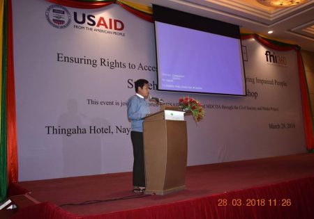 USAID FHI 360 CSM Project ၏ ပံ့ပိုးမႈျဖင့္ ျမန္မာႏိုင္ငံနားမၾကားသူမ်ား ဖြံ႕ၿဖိဳးတိုးတက္ေရးအဖြဲ႕က အေကာင္အထည္ေဖာ္ ေဆာင္ရြက္ခဲ့ေနေသာ နားမၾကားသူမ်ားအတြက္ သတင္းအခ်က္အလက္ လက္လွမ္းမီ ရရိွပိုင္ခြင့္ ေသခ်ာေစေရး စီမံကိန္း၏ Stakeholders Consultative Workshop အလုပ္ရံုေဆြးေႏြးပြဲတစ္ရပ္ကို ေနျပည္ေတာ္ သဂၤဟ ဟိုတယ္၌ ၂၈-၃-၂၀၁၈ ရက္ေန႕တြင္ ေအာင္ျမင္စြာ ျပဳလုပ္ႏိုင္ခဲ့ပါသည္။ အဆိုပါအခမ္းအနားသို႕ ျပန္ၾကားေရးဝန္ႀကီးဌာန၊ ဒုတိယ ဝန္ႀကီး ဦးေအာင္လွထြန္း က အဖြင့္အမွာစကား ေျပာၾကားခဲ့ၿပီး လူမႈဝန္ထမ္း၊ ကယ္ဆယ္ေရးႏွင့္ ျပန္လည္ ေနရာခ်ထားေရးဝန္ႀကီးဌာန၊ ျပန္လည္ထူေထာင္ေရးဦးစီးဌာန ညြန္ၾကားေရးမွဴးခ်ဳပ္၊ ဦးဝင္းႏိုင္ထြန္း၊ ထိခိုက္လြယ္အုပ္စုမ်ားဌာနခြဲ ညြန္ၾကားေရးမွဴး ဦးစြမ္းရည္ရ၊ ျမန္မာ့အသံႏွင့္ရုပ္ျမင္သံၾကား မွ ညြန္ၾကားေရးမွဴး ေဒၚမိုးူသူဇာေအာင္ အပါအဝင္ ဝန္ႀကီးဌာနမ်ားမွ တာဝန္ရိွသူမ်ား၊ နားမၾကားေက်ာင္းမ်ားႏွင့္ အဖြဲ႕အစည္းမ်ားမွ တာဝန္ရိွသူမ်ား တက္ေရာက္ပါဝင္ ေဆြးေႏြးခဲ့ပါသည္။