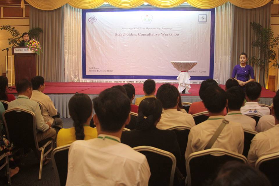 CEDAW (စီေဒါ) ကို လက္သေကၤတျပဘာသာစကားျဖင့္ခ်ဥ္းကပ္ျခင္း က႑စံုမွပါဝင္ပတ္သက္သူမ်ားႏွင့္ အၾကံျပဳအလုပ္ရံုေဆြးေႏြးပြဲ ကို စက္တင္ဘာလ(၁၇)ရက္ေန႔တြင္ ရန္ကုန္ၿမိဳ႕၊ Summit Parkview Hotel တြင္ လူမႈ၀န္ထမ္းဦးစီးဌာန – DSW, Gender Equaility Network – GEN ႏွင့္ ျမန္မာႏုိင္ငံ နားမၾကားသူမ်ား ဖြံ႕ျဖိဳးတိုးတက္ေရးအဖြဲ႕ – MDCDA အဖြဲ႔တို႔မွ ပူးေပါင္းက်င္းပခဲ့ပါသည္။